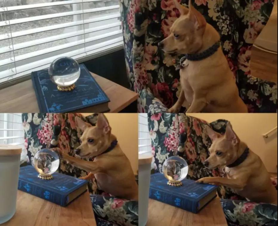 主人剛開始不解,回來站到狗狗的角度,他才發現原來通過水晶球可以看見窗戶外的人行道,要是看到表現怪異的人,狗砸就會更不得鉆進球里去視察......